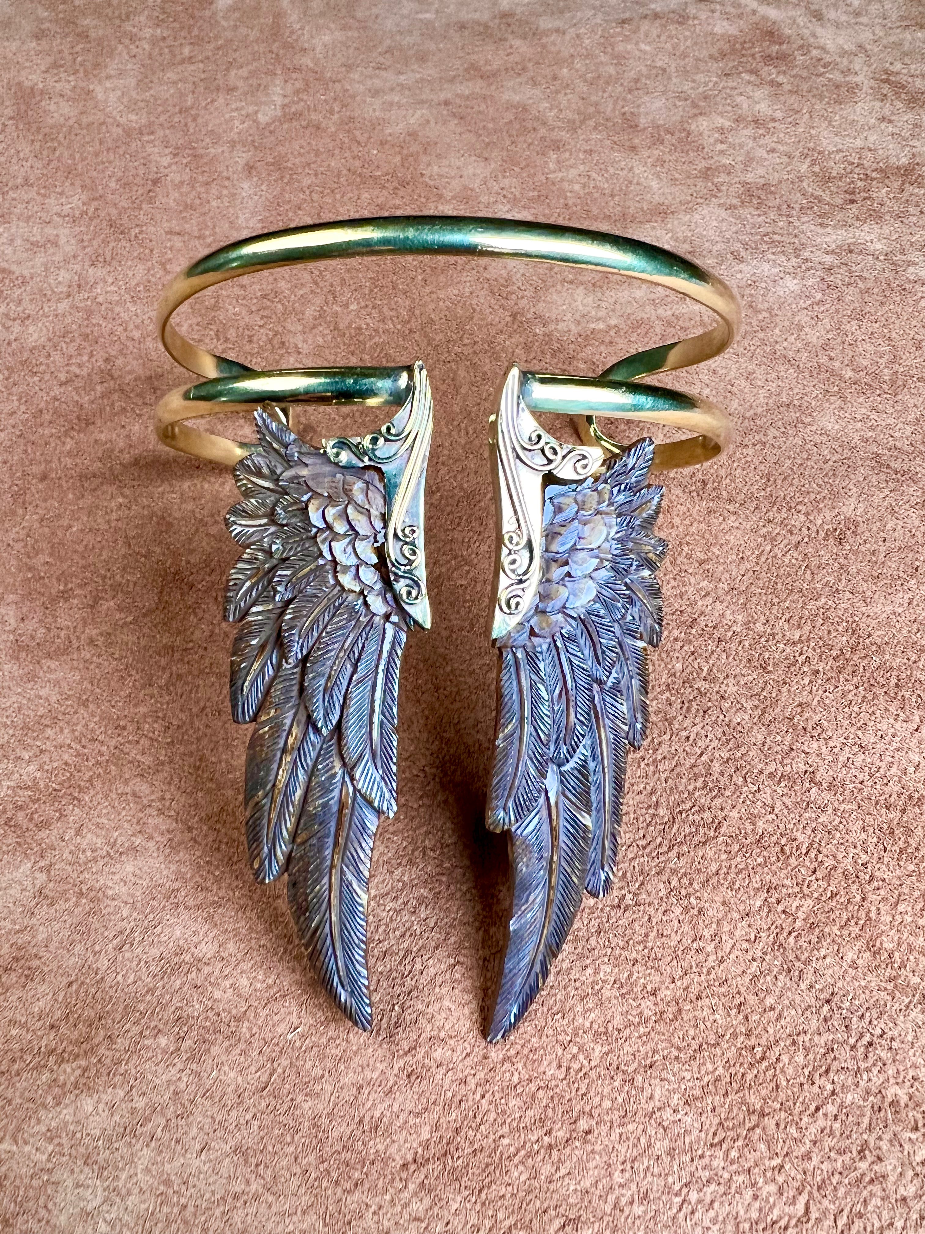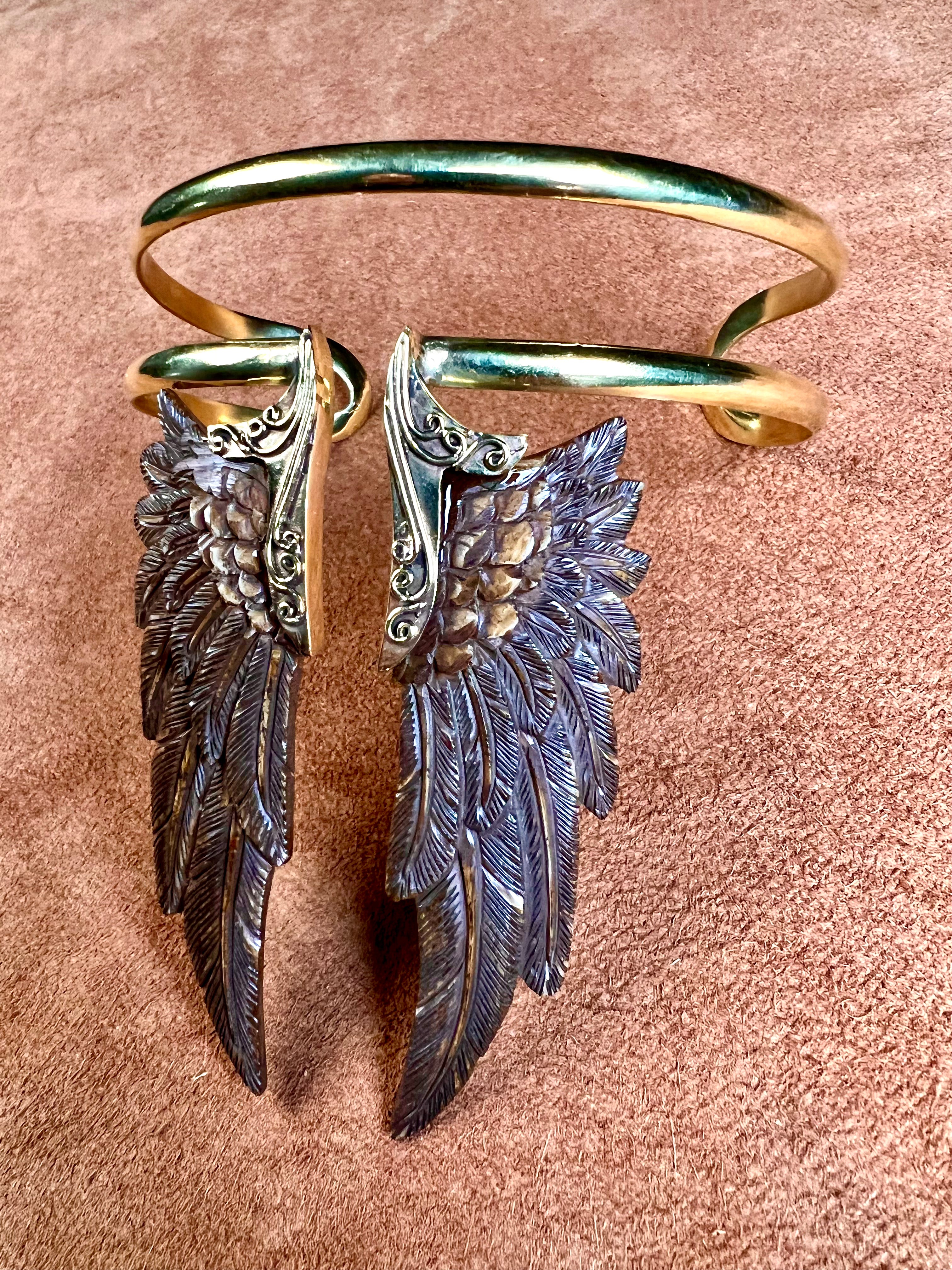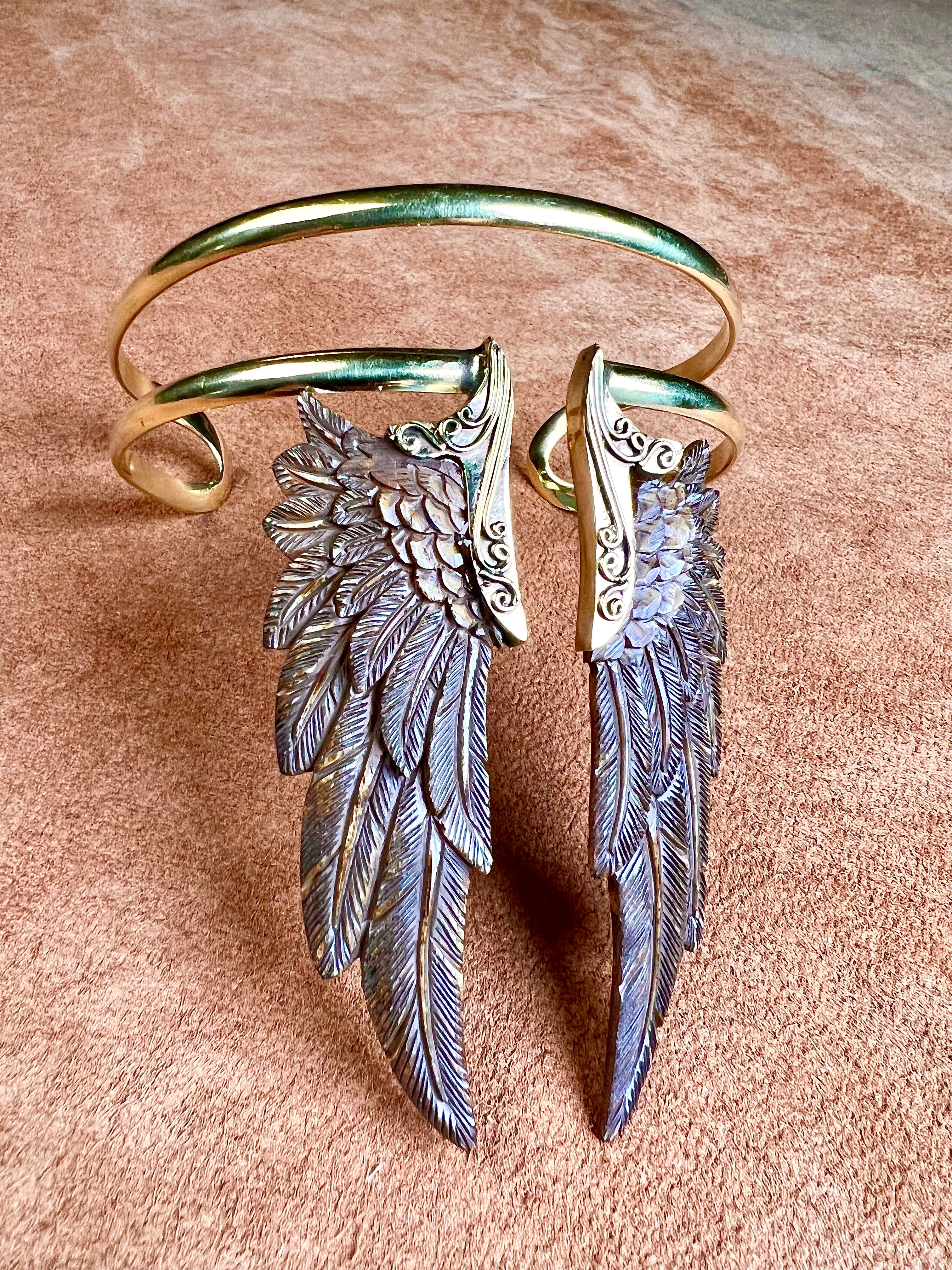 Let your spirit take flight with our hand-carved Angel Wing Armband — a bold statement piece designed to wrap the upper arm with effortless grace. Crafted from natural wood and warm golden brass, each wing is shaped by hand, carrying a sense of protection, freedom, and divine feminine energy.