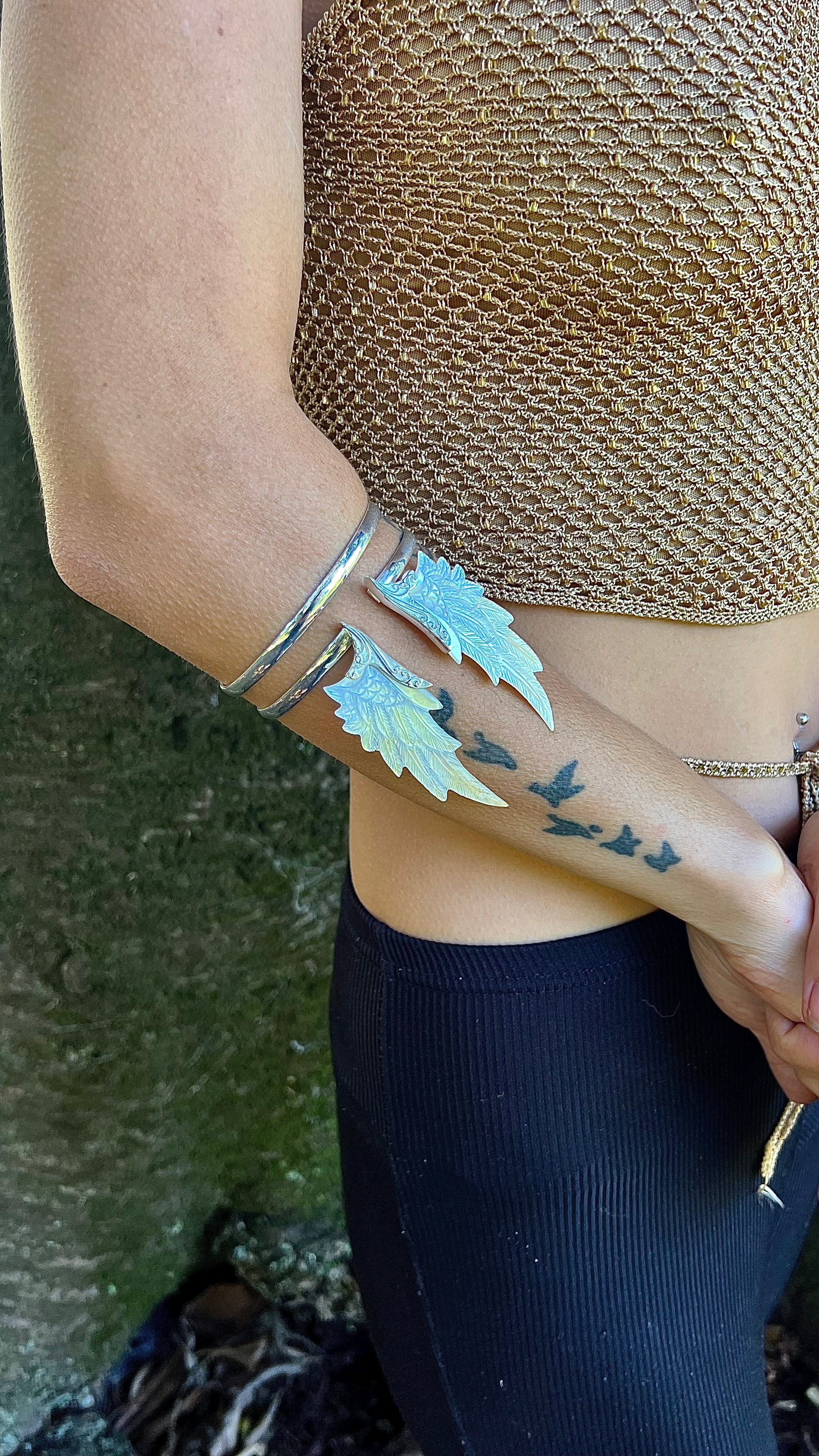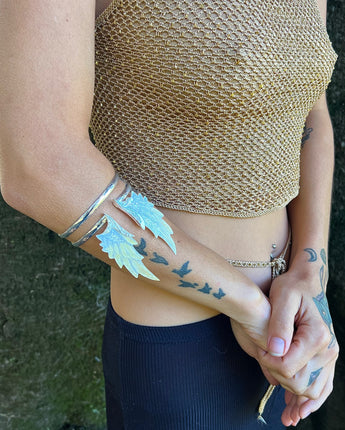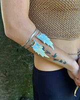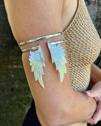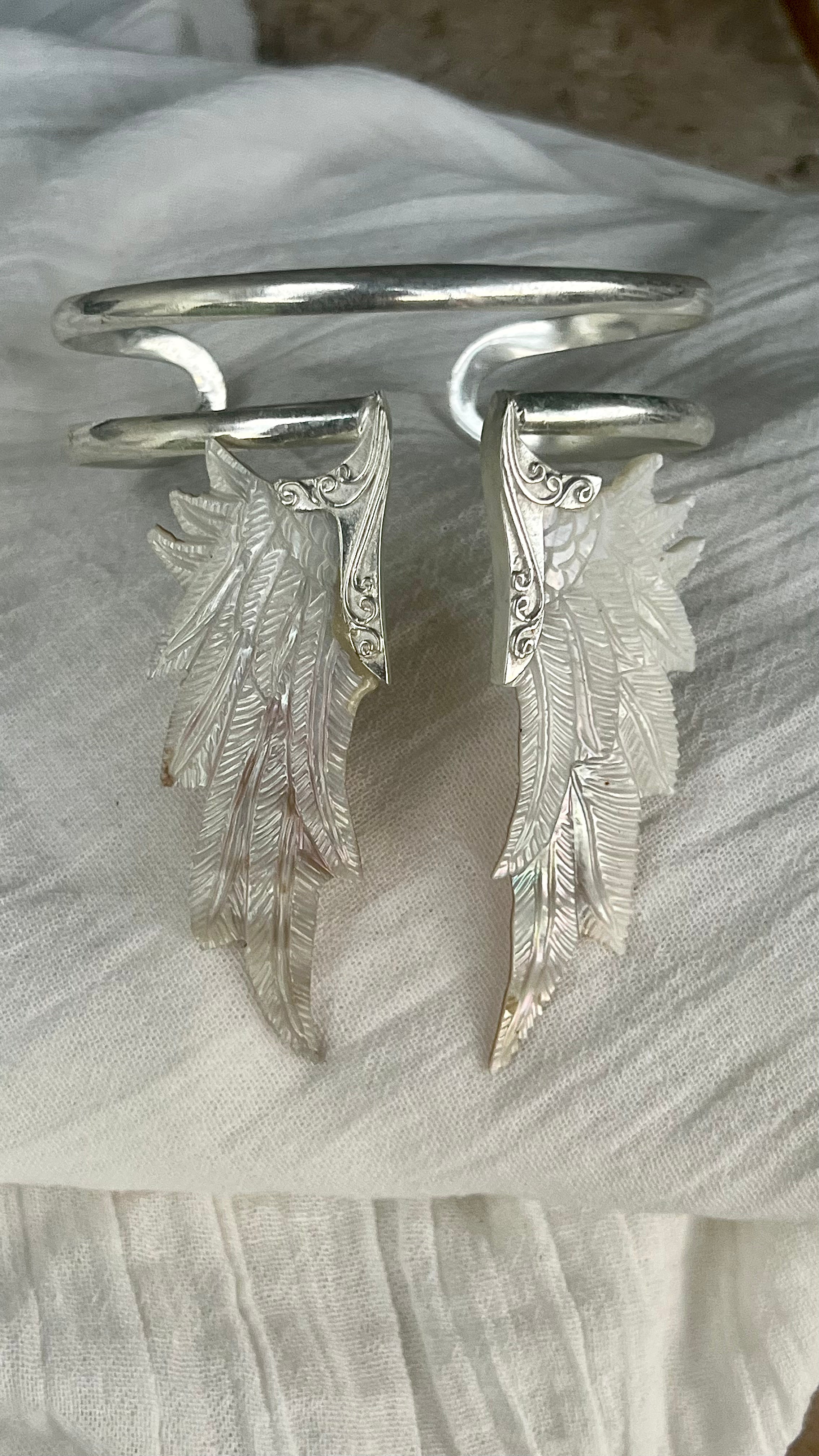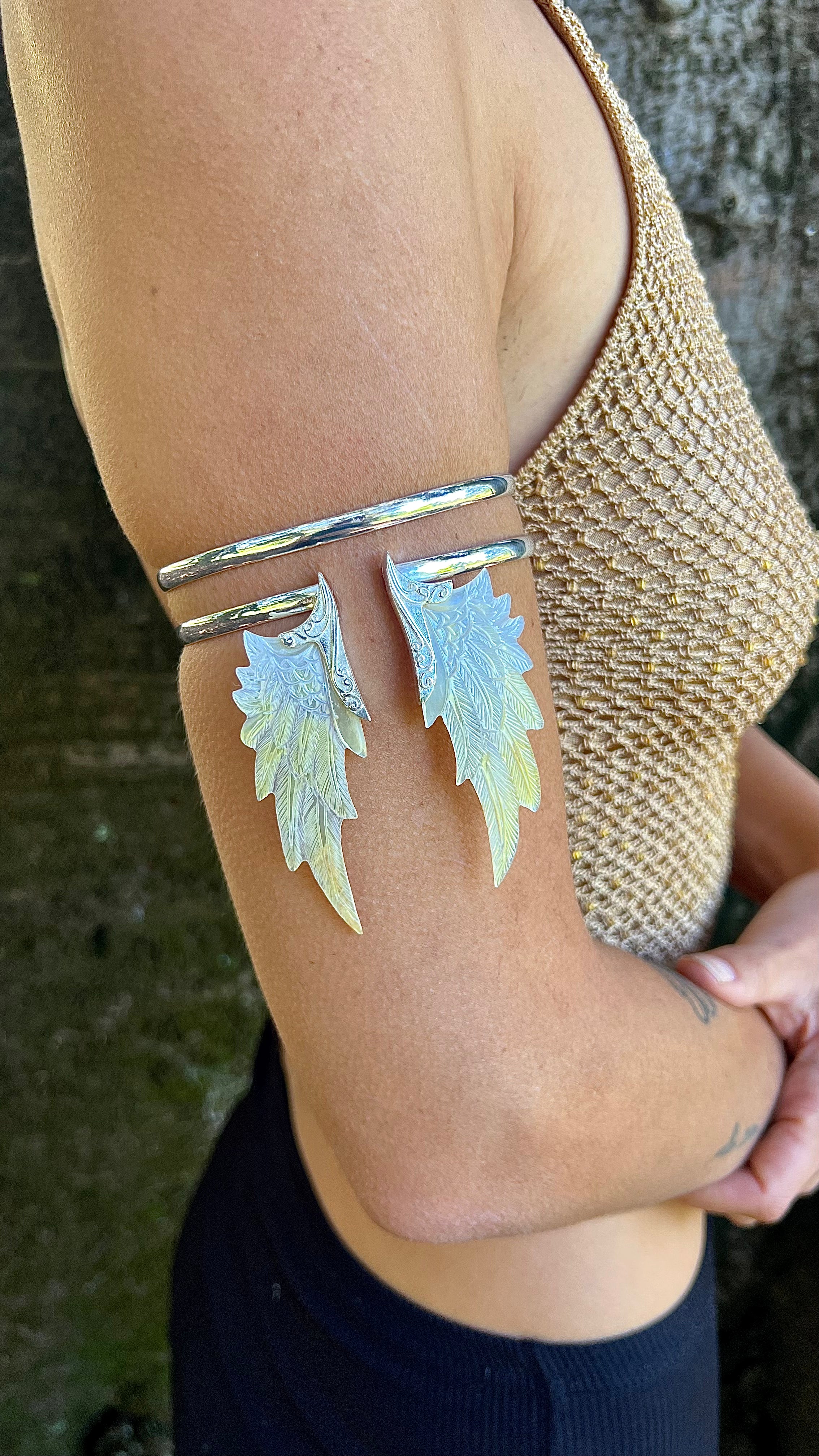 One of our most magical and stunningly unique designs💗 Immaculately handmade with love for the fellow Angel & Pixie at heart, our hand carved shell and white brass armband is truly a statement piece to be admired ! A stunning statement piece that will turn heads wherever you go! Whether your dancing at a festival or honouring yourself with a walk through nature, this magical piece will having u floating with grace 💫 Handcrafted with intention from high grade (nickel free) white brass and Ethically sourced Abalone shell. Abalone healing carries energies of protection and emotional balance. It brings with it a natural shielding that blesses the person holding it with tranquility. Ethically handcrafted with love, for the arm or forearm.