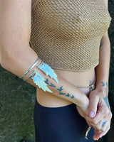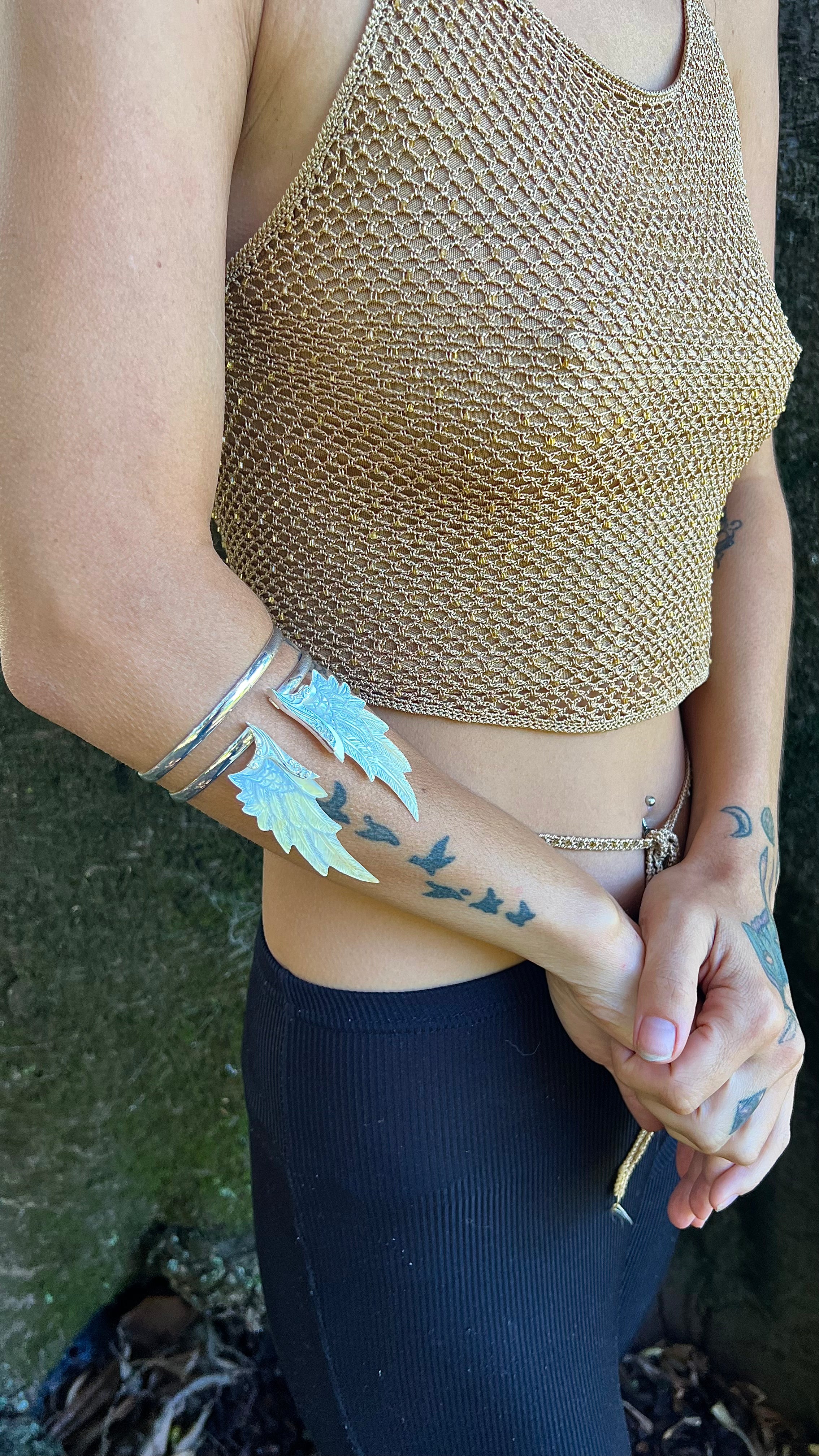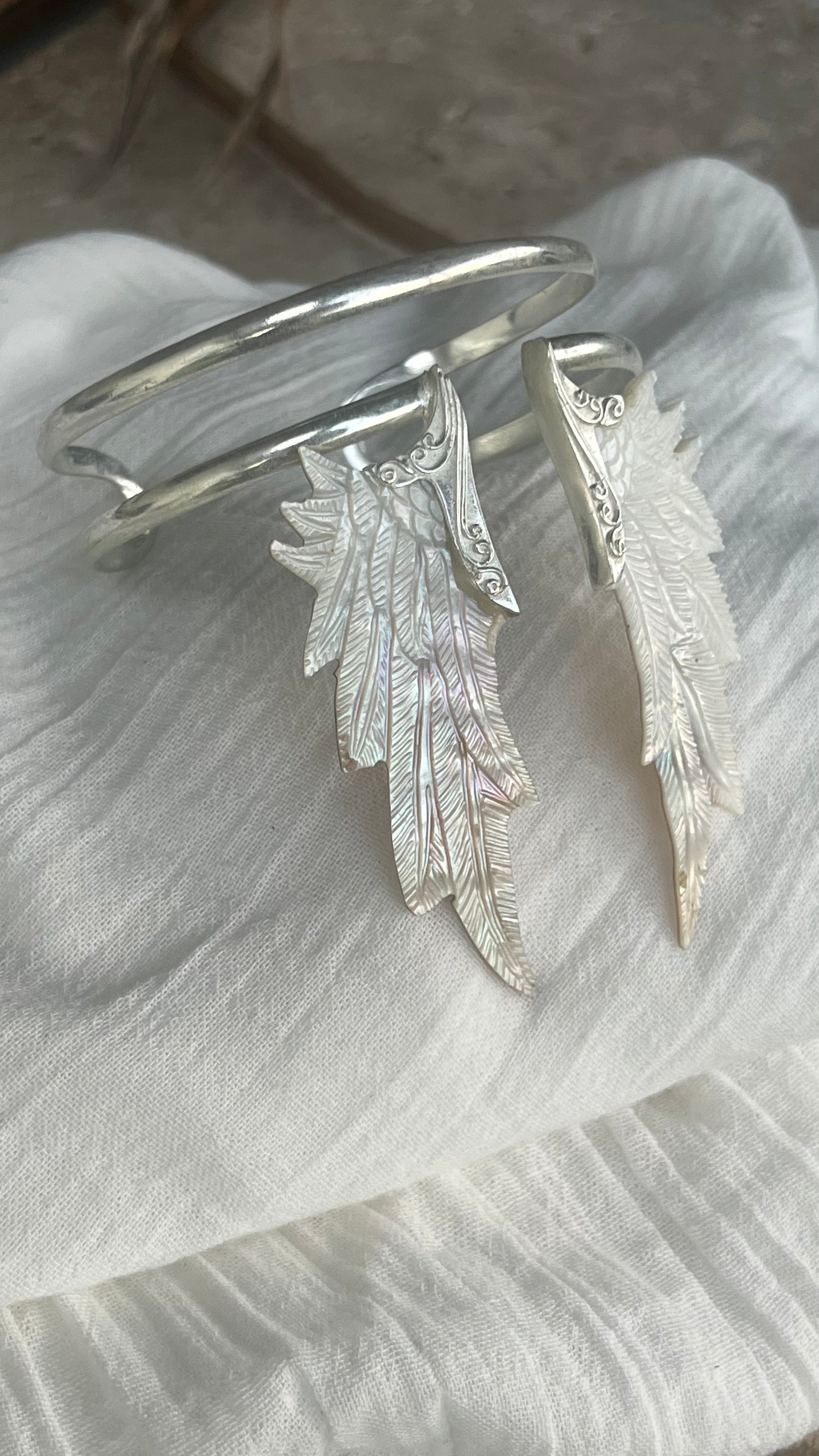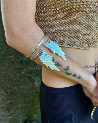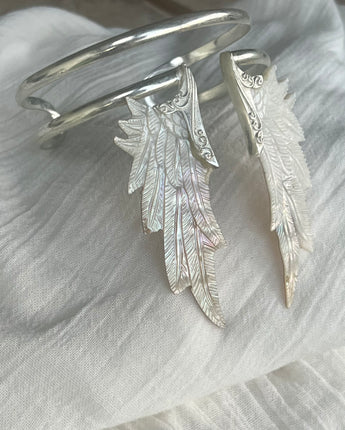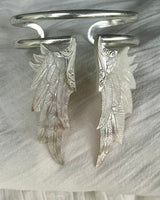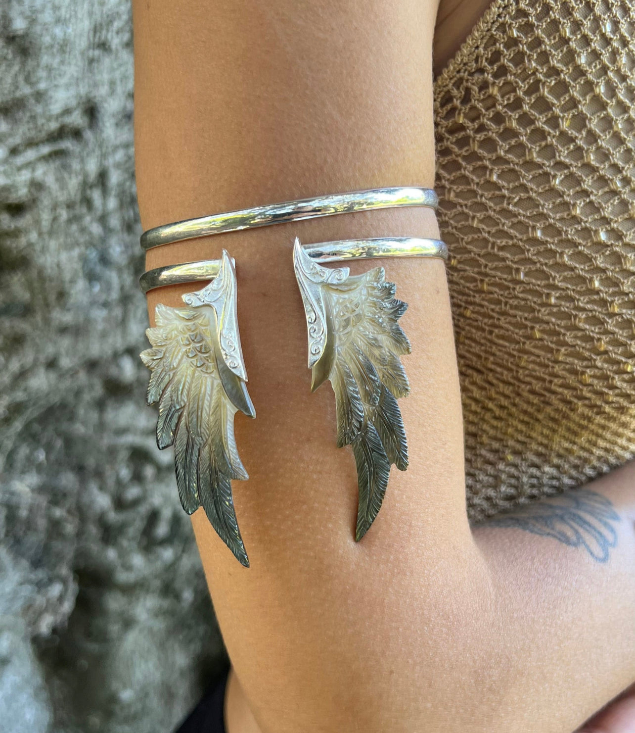 One of our most magical and stunningly unique designs💗 Immaculately handmade with love for the fellow Angel & Pixie at heart, our hand carved shell and white brass armband is truly a statement piece to be admired ! A stunning statement piece that will turn heads wherever you go! Whether your dancing at a festival or honouring yourself with a walk through nature, this magical piece will having u floating with grace 💫 Handcrafted with intention from high grade (nickel free) white brass and Ethically sourced Abalone shell. Abalone healing carries energies of protection and emotional balance. It brings with it a natural shielding that blesses the person holding it with tranquility. Ethically handcrafted with love, for the arm or forearm.