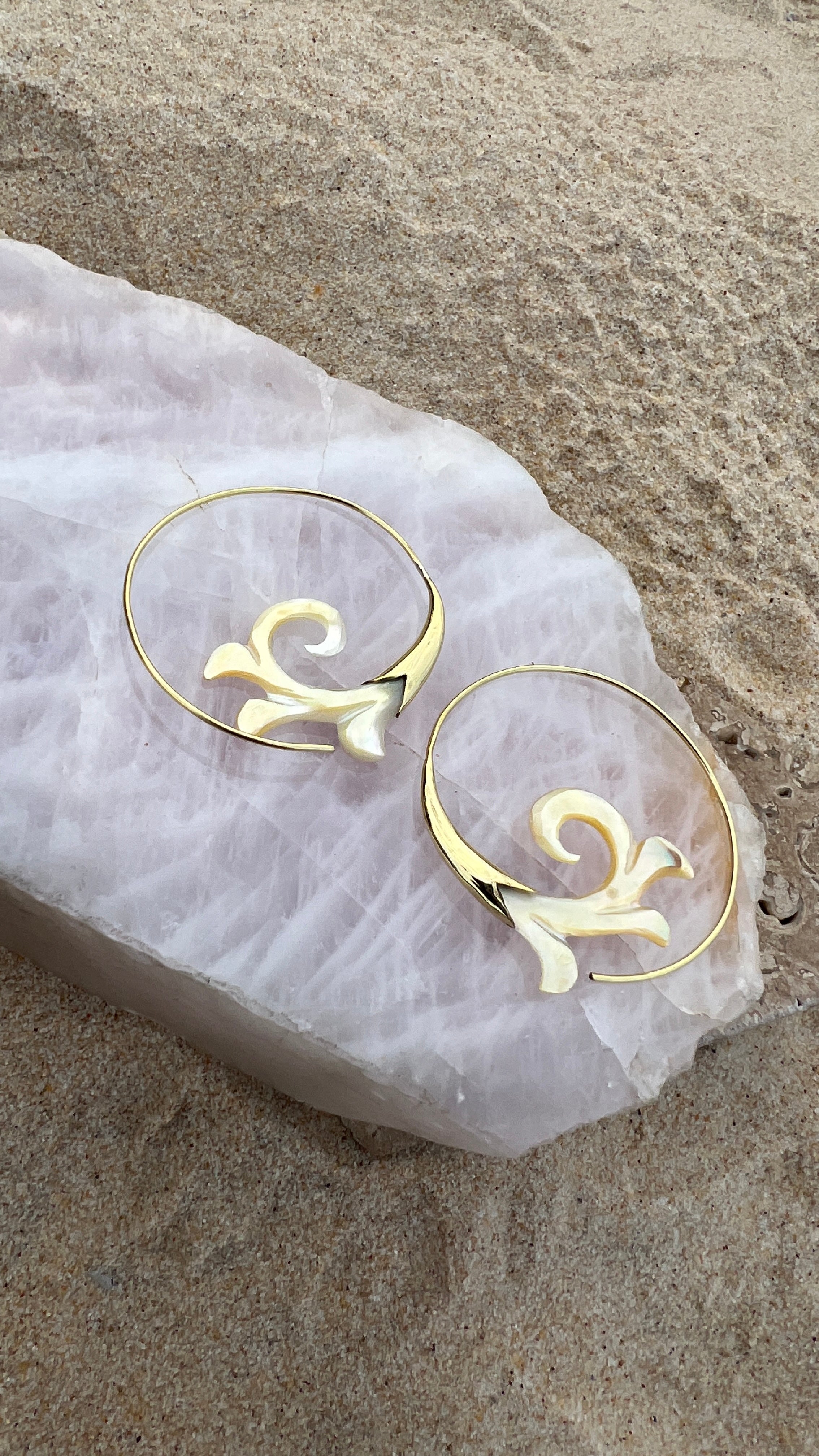 Immerse yourself in the captivating allure of our ocean-inspired hand carved shell and brass Gabriel earrings. These exquisite earrings are meticulously crafted to embody the ethereal beauty of the sea. The lustrous hand-carved shells, carefully selected for their mesmerizing patterns and iridescent hues, evoke the gentle whispers of ocean waves and the warmth of sun-drenched beaches. The intricate brass frames, adorned with delicate carvings inspired by marine life, add a touch of elegance and whimsy to the design. With their lightweight and comfortable construction, these earrings can be worn all day long, allowing you to carry a piece of the ocean's magic with you wherever you go. Indulge in the enchantment of the sea and elevate your style with our captivating Gabriel earrings.