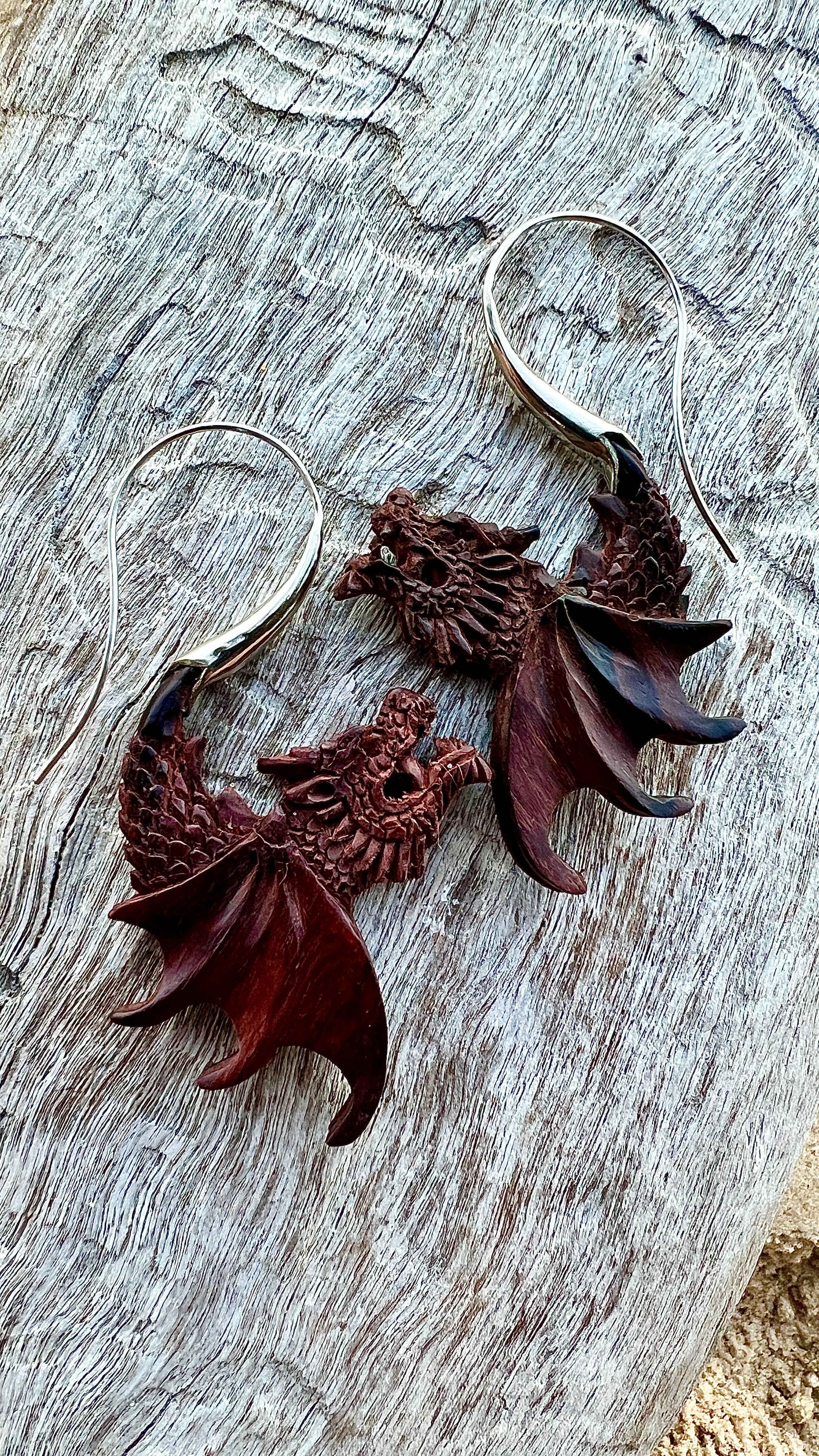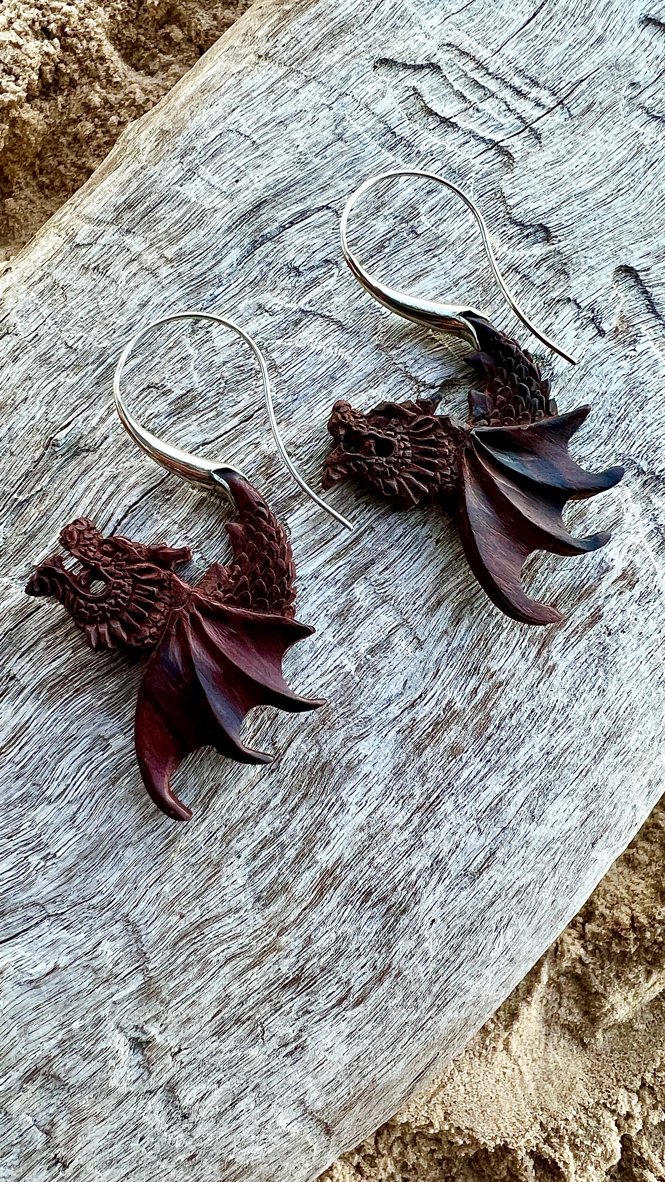 Hand-Carved Wood & Silver Dragon Earrings