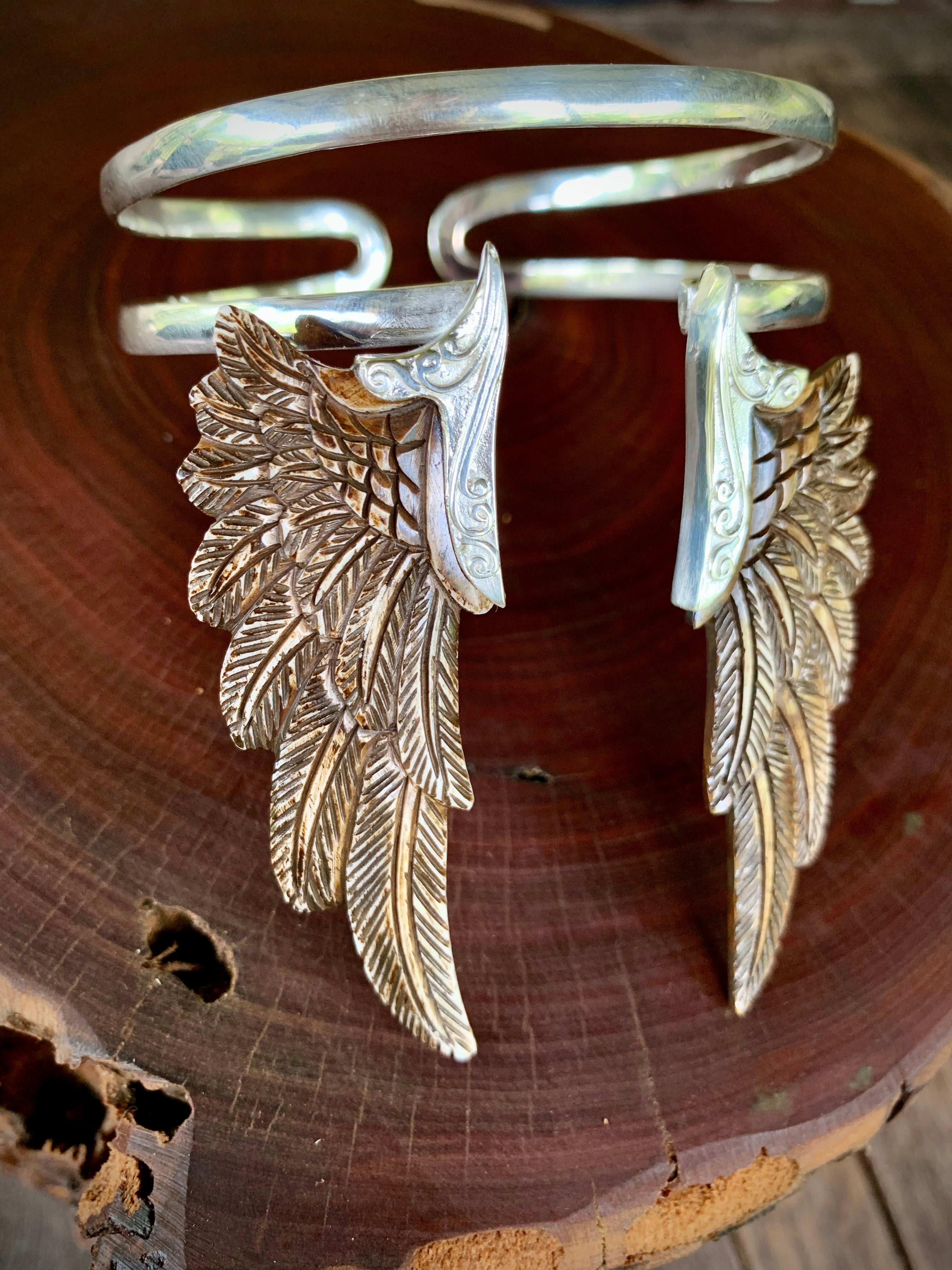 Take your style higher with our Hand-Carved Bone & Silver Angel Wing Armband — a striking upper-arm adornment crafted for free spirits, festival lovers, and wild-at-heart women.