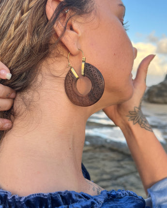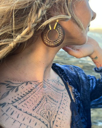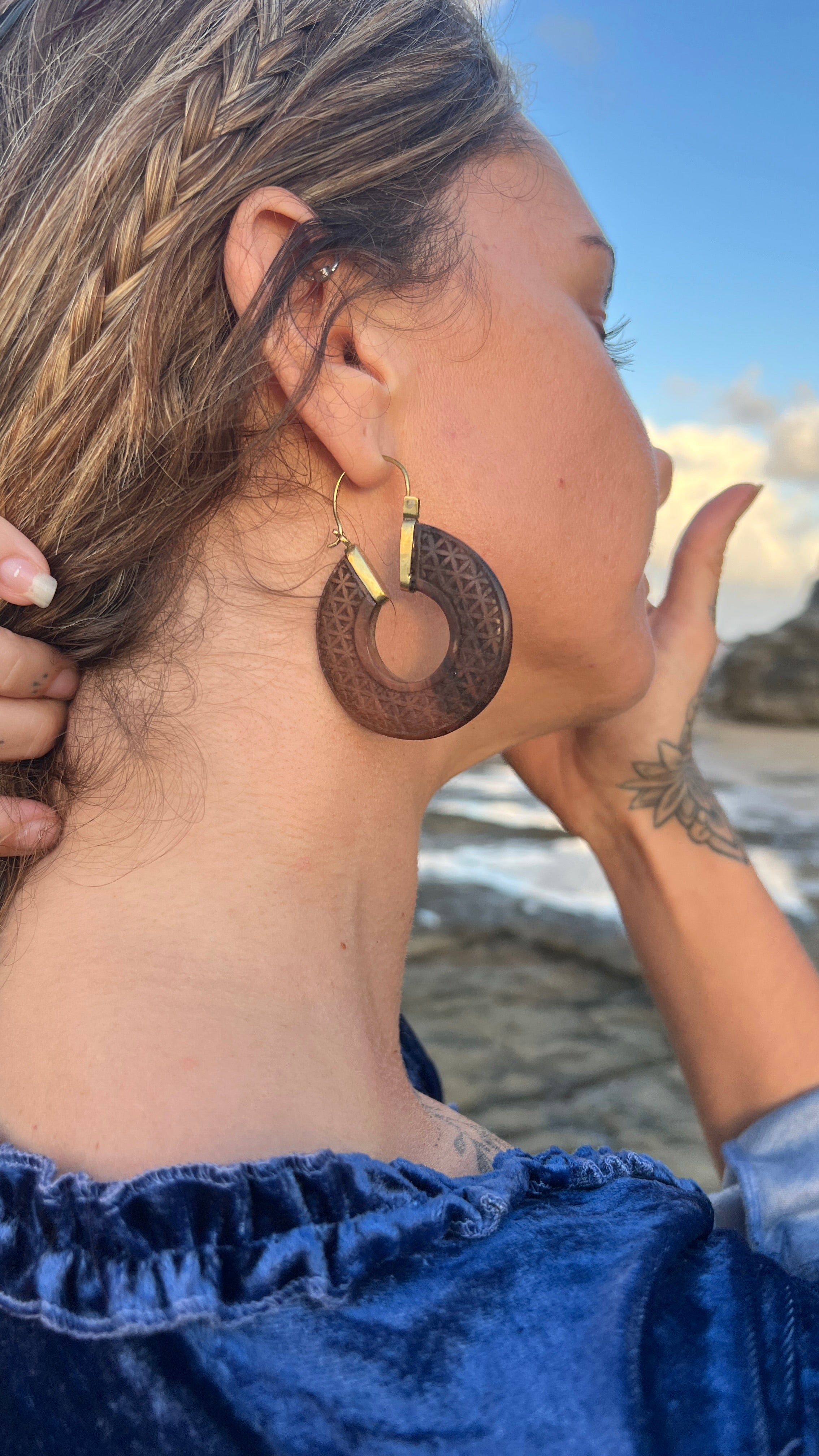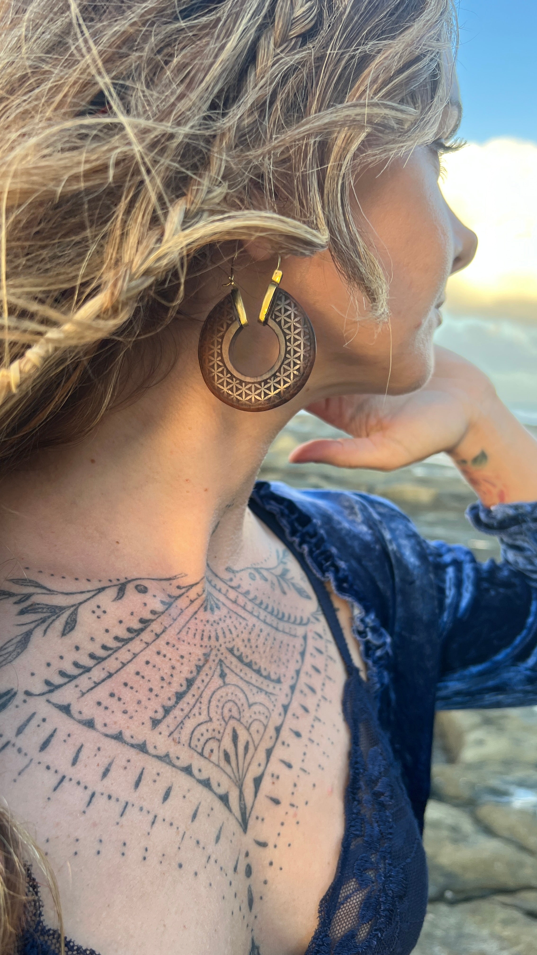 Introducing our stunning Hand Carved Wood and Brass Flower of Life Earrings, the perfect addition to your jewellery collection. These earrings are meticulously crafted from high-quality wood and nickel free brass to create a unique and intricate design that is sure to turn heads.