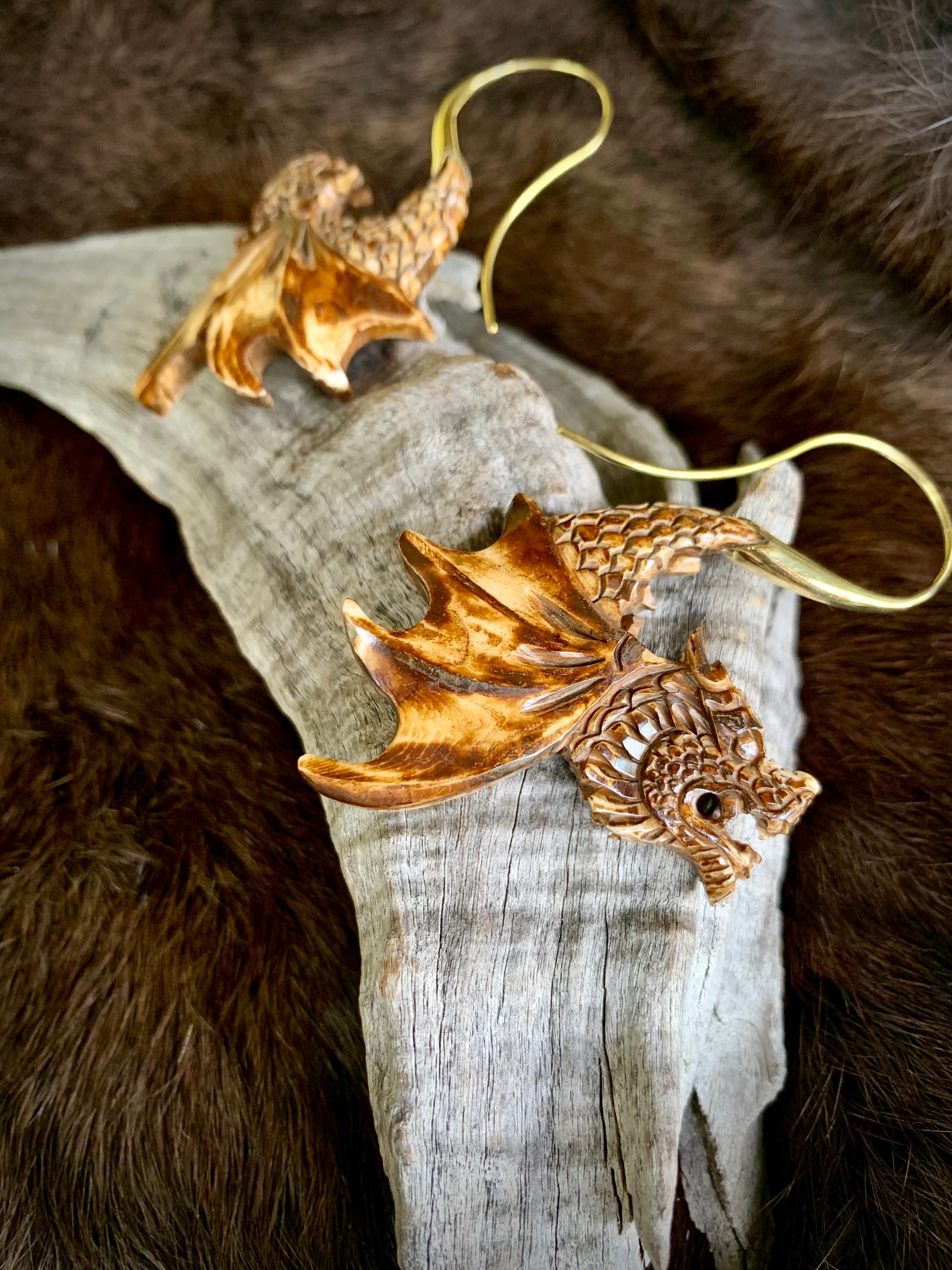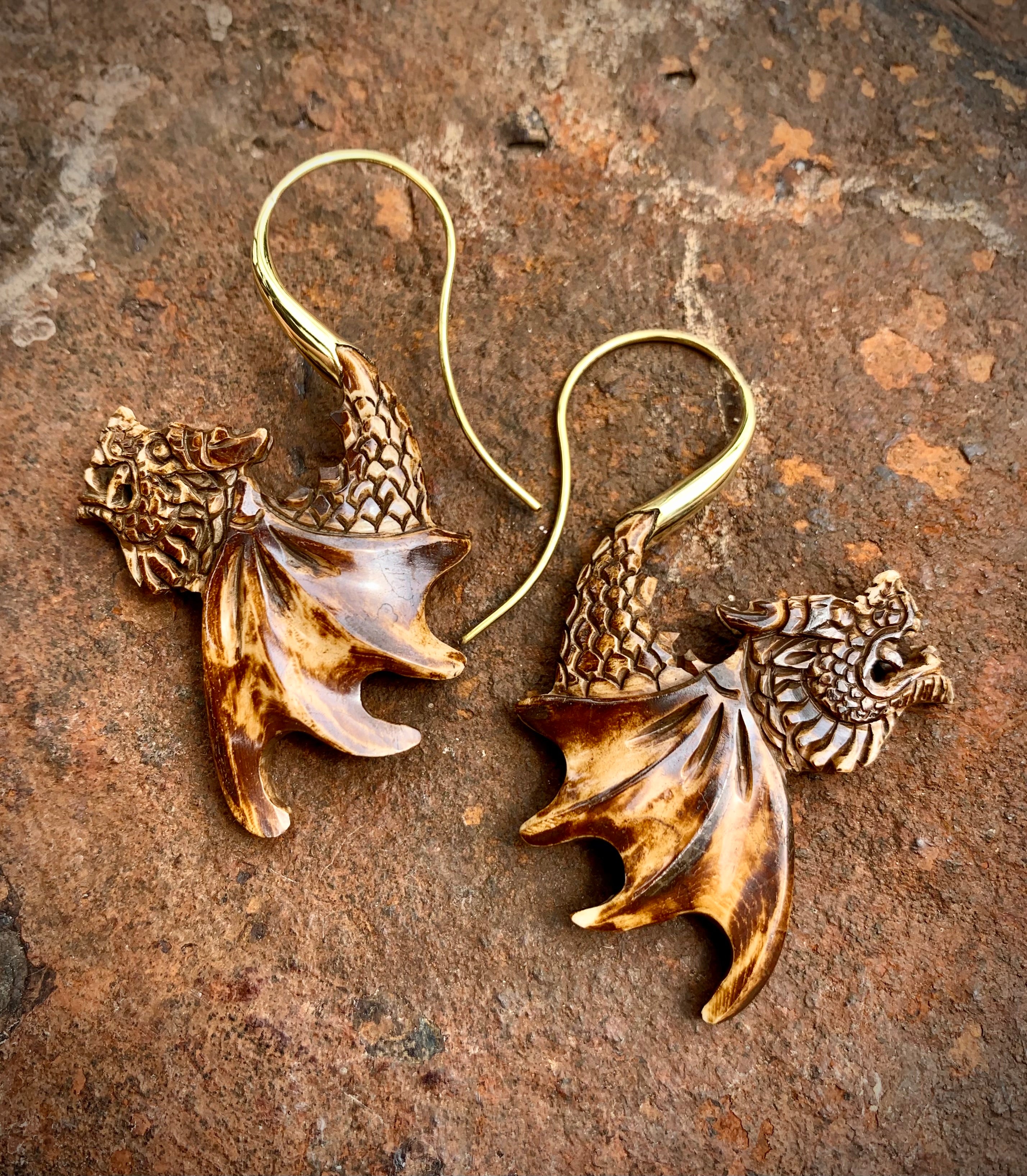 Bold yet beautifully balanced, the Guardian Dragon Earrings feature intricately hand-carved dragon forms crafted from smooth, darkened buffalo bone and suspended from warm brass hooks.