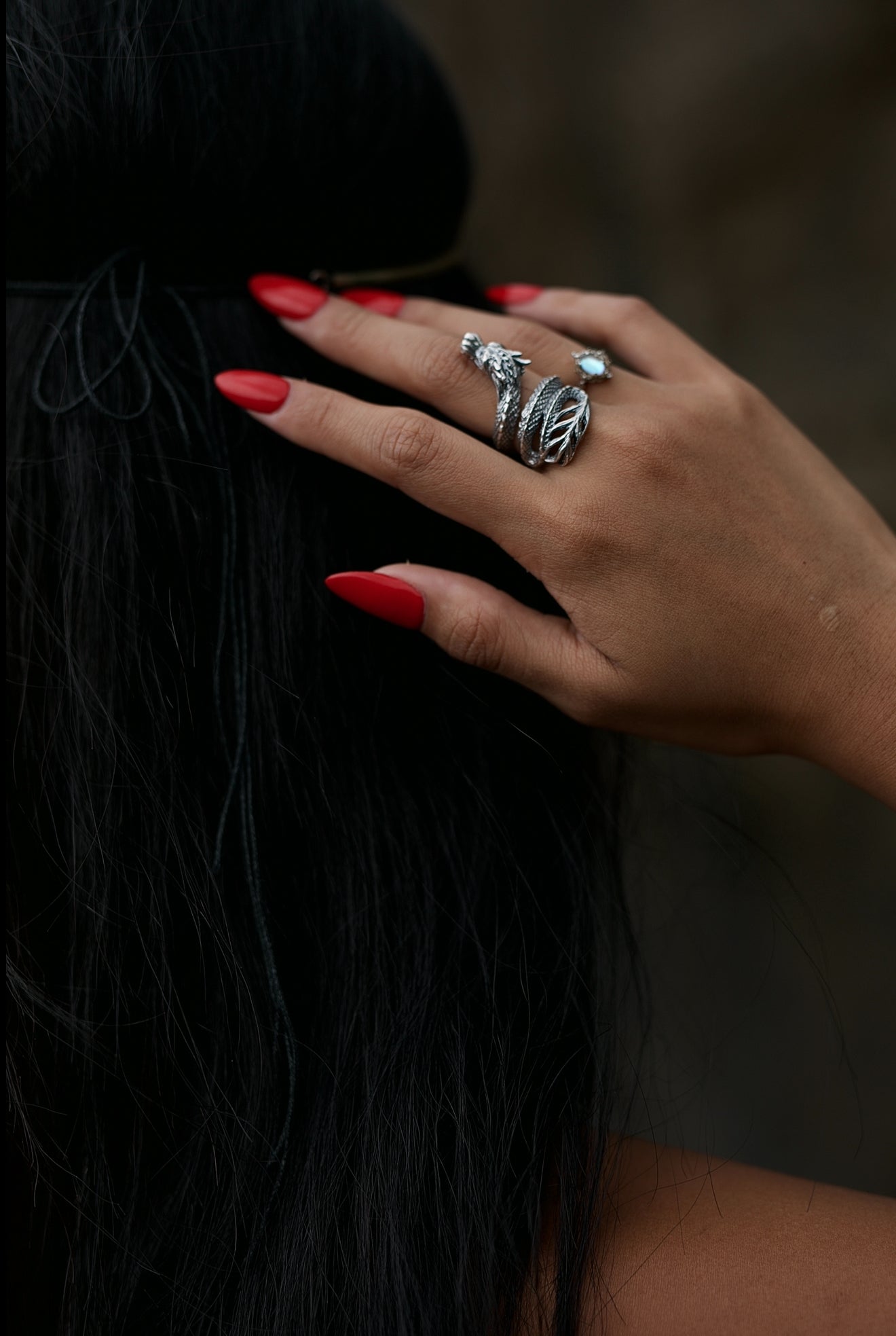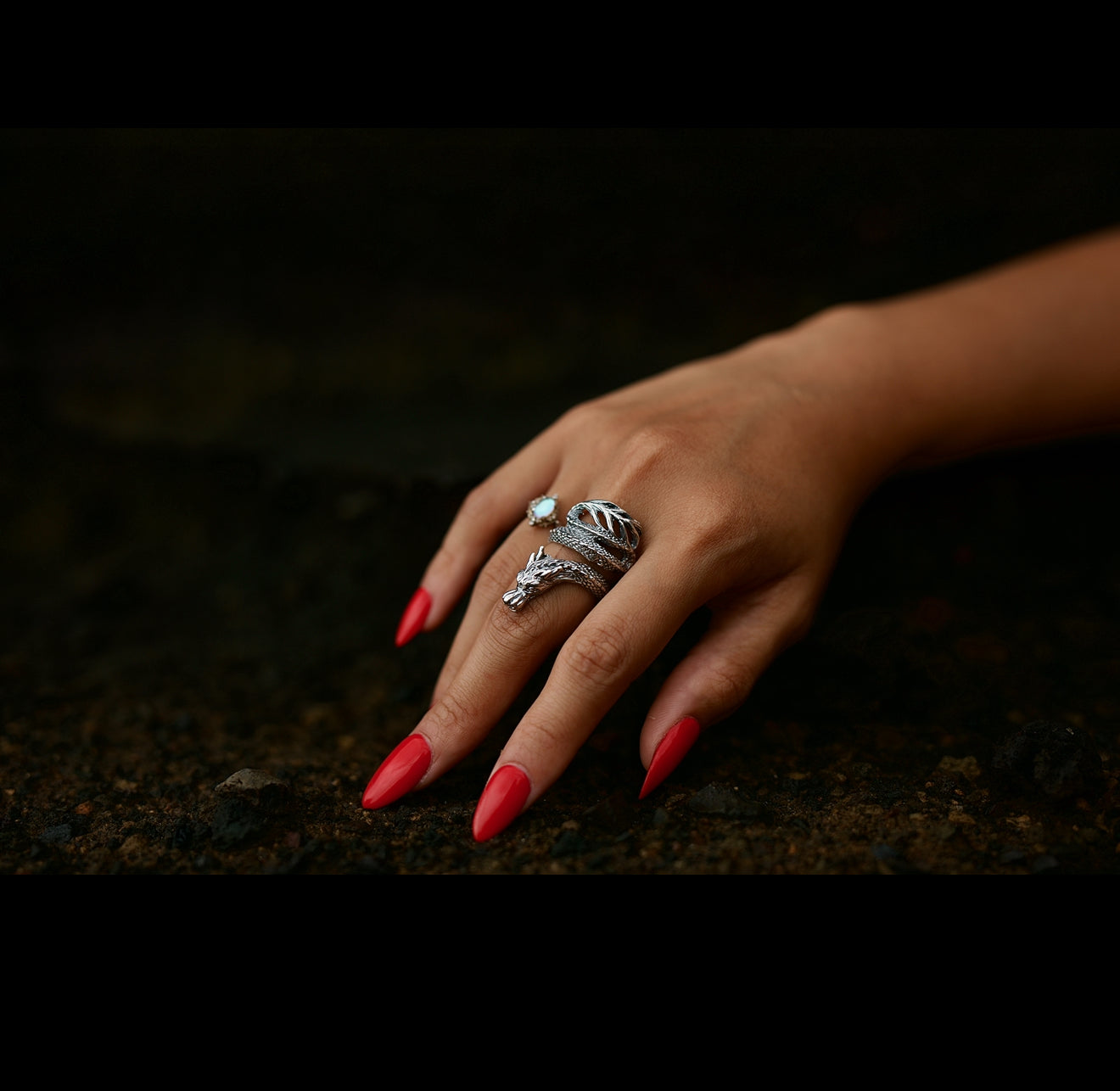 The Kundalini Serpent Ring coils around the finger as a symbol of transformation, protection and rising life force. Inspired by ancient serpent energy and the awakening of inner power, this striking piece is designed for those walking a conscious, fearless path.