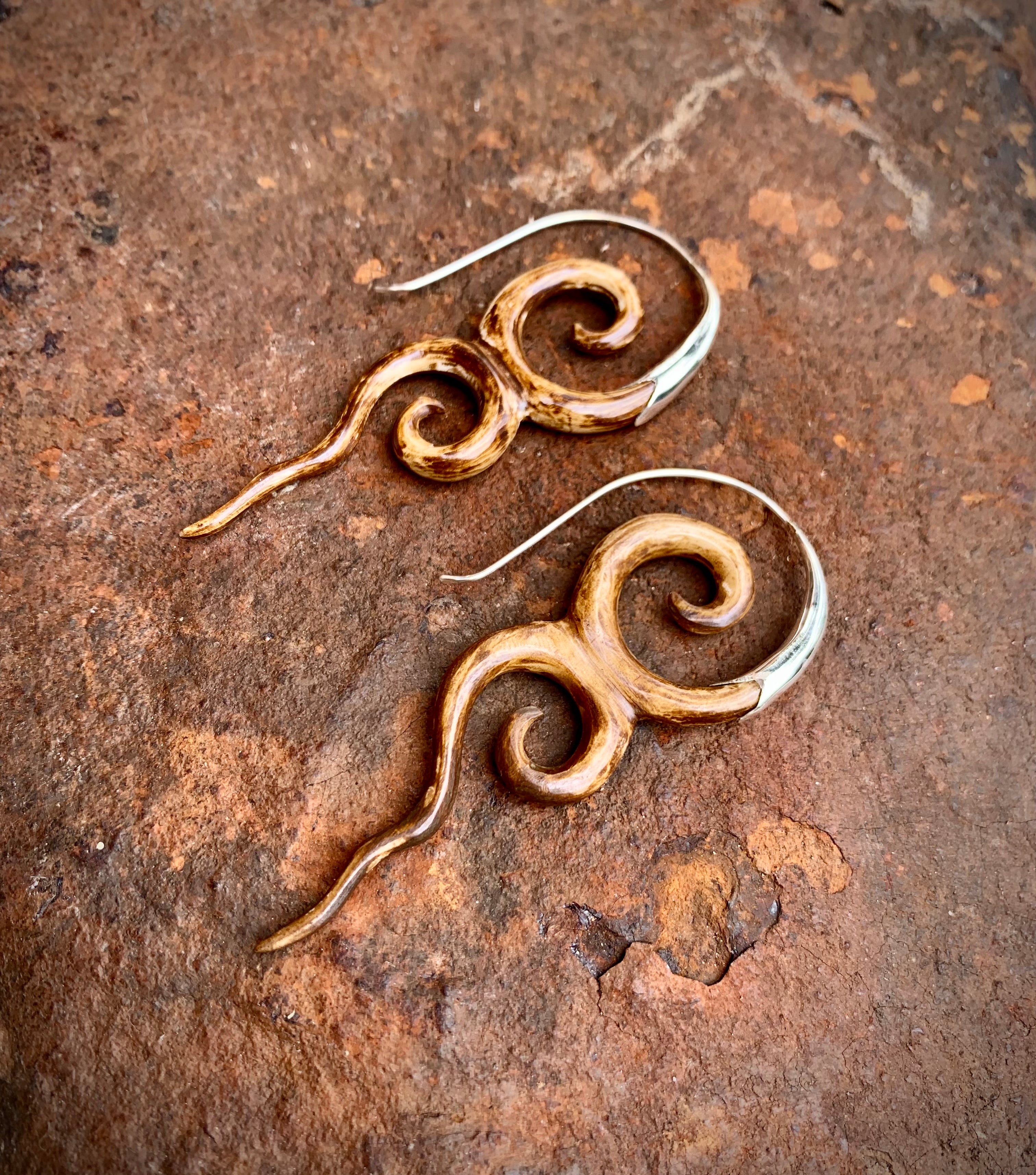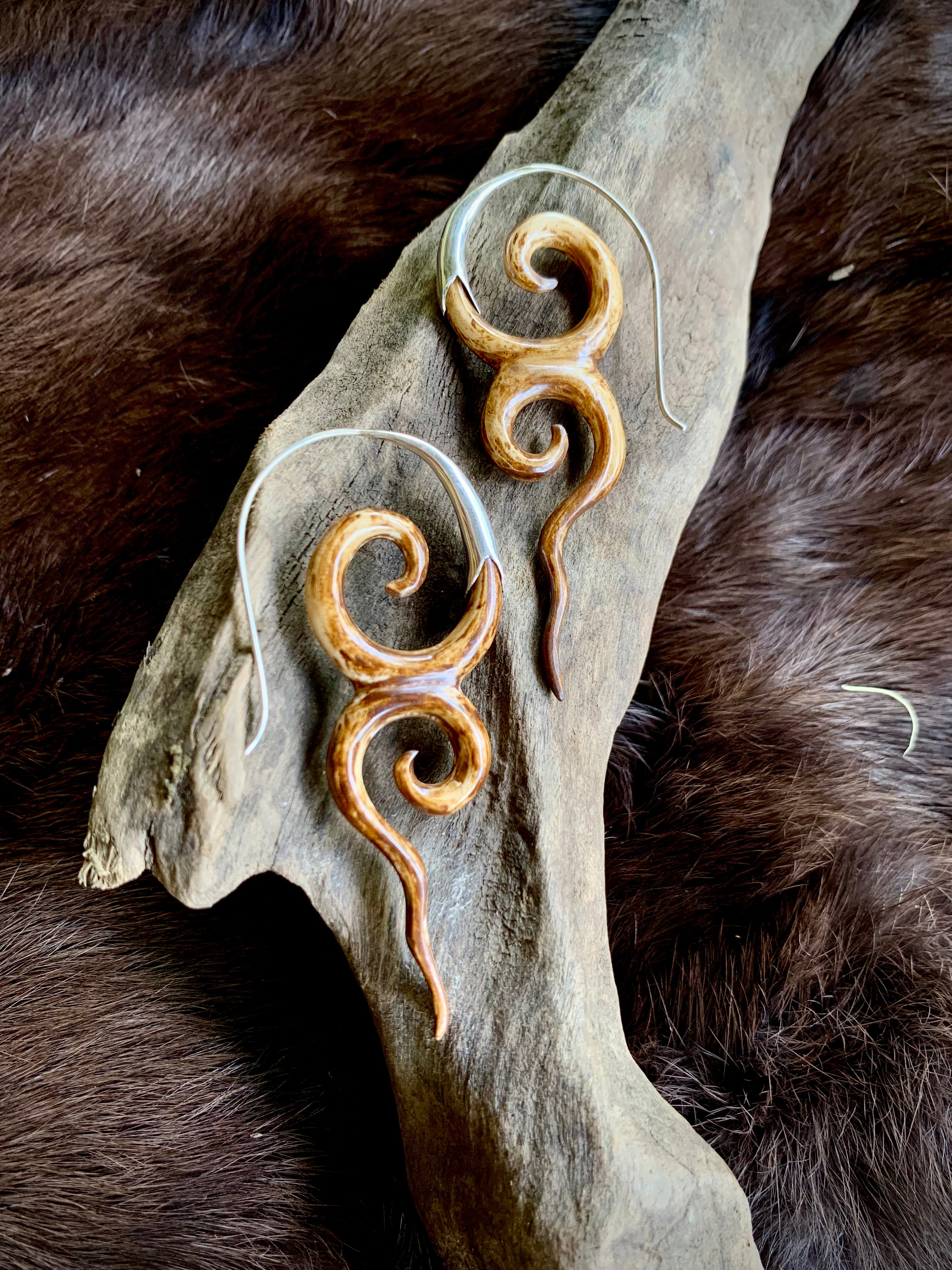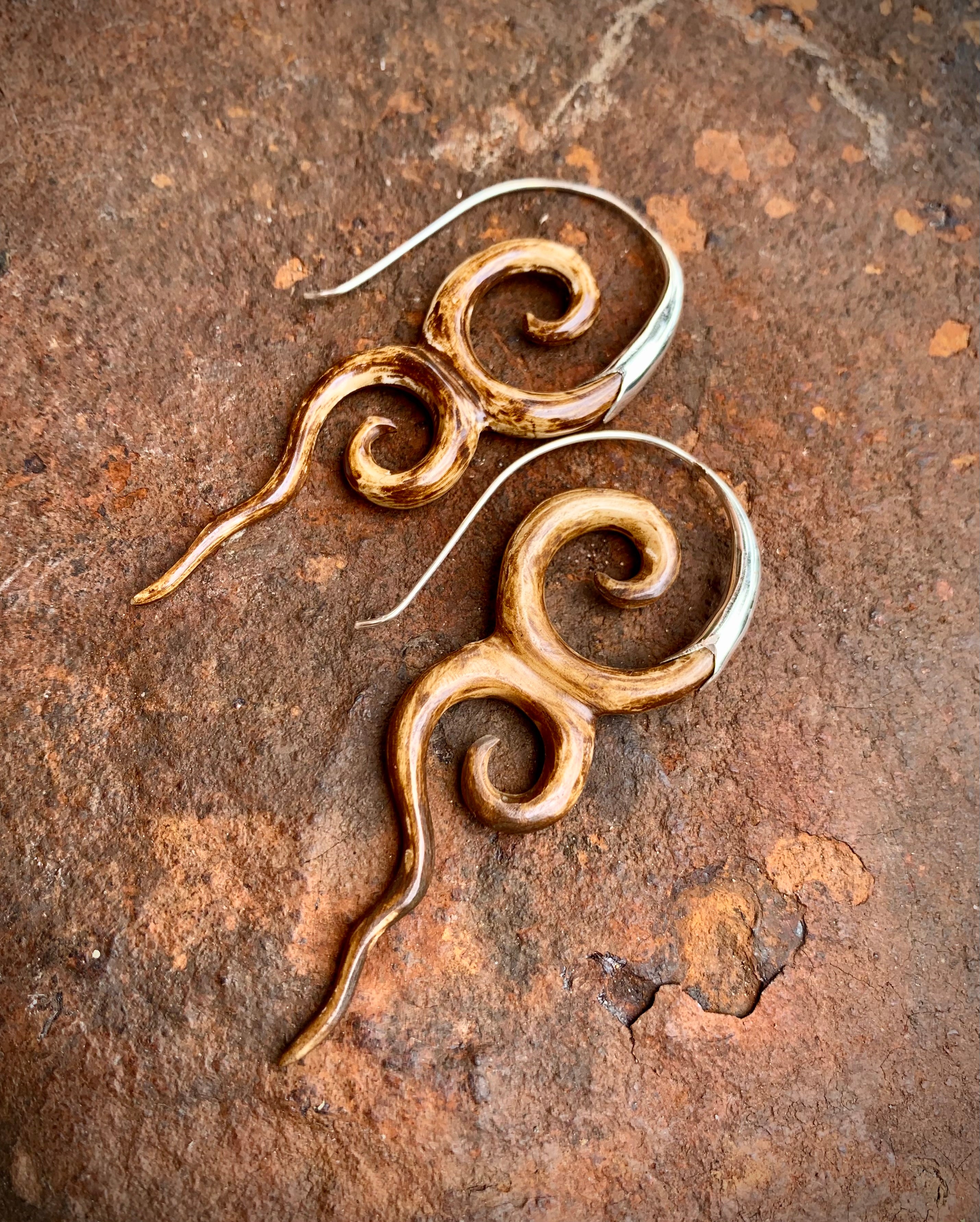 The River Goddess Earrings are inspired by the flowing energy and quiet strength of water. Featuring smooth, hand-carved dark buffalo bone paired with sterling silver, these earrings echo the gentle curves and movement of a winding river.